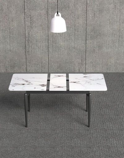 Chất liệu: Bàn ăn khung sắt , mặt bàn điều chỉnh kích thước bằng hệ thống ray trượt thông minh. Mặt bàn đá ceramic dày 12mm. Chỉ có màu trắng vân