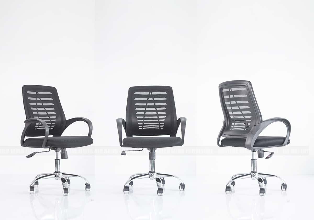 ghế văn phòng cấu tạo lưng trung đệm tựa bọc lưới siêu bền, chân xoay bằng thép mạ sáng bóng, bánh xe nhựa chịu lực di chuyển nhẹ nhàng.