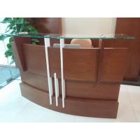 Mẫu thiết kế quầy lễ tân QLT19 theo kiểu dáng uốn cong hình chữ C với những đường nét nổi đẹp ấn tượng, phần trên là mặt kính cừng lực có trụ đỡ bằng Inox