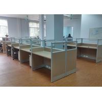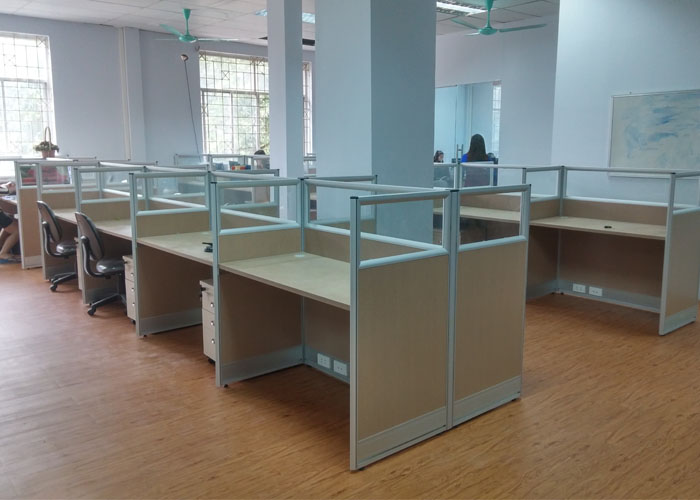 Mẫu vách ngăn văn phòng chia module bàn làm việc được cấu tạo bằng gỗ Melamine kết hợp với phần kính trắng phía trên tạo ra một không gian làm việc mở có tính độc lập cao, vách được chia theo số lượng bàn làm việc, có thể xếp theo hàng hoặc xếp đối mặt nhau tùy theo diện tích mặt bằng.
